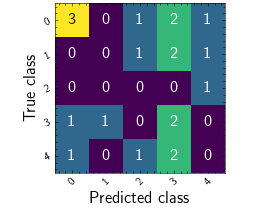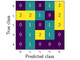 The confusion matrix \(C\) is constructed such that \(C_{i, j}\) is equal to the number of observations known to be in class \(i\) but predicted to be in class \(j\). Thus row indices of the confusion matrix correspond to the true class labels and column indices correspond to the predicted class labels.