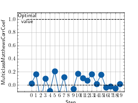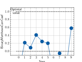 >>> from torch import rand, randint >>> # Example plotting multiple values >>> from torchmetrics.classification import BinaryMatthewsCorrCoef >>> metric = BinaryMatthewsCorrCoef() >>> values = [ ] >>> for _ in range(10): ... values.append(metric(rand(10), randint(2,(10,)))) >>> fig_, ax_ = metric.plot(values)
