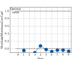 >>> from torch import rand, randint >>> # Example plotting multiple values >>> from torchmetrics.classification import MultilabelMatthewsCorrCoef >>> metric = MultilabelMatthewsCorrCoef(num_labels=3) >>> values = [ ] >>> for _ in range(10): ... values.append(metric(randint(2, (20, 3)), randint(2, (20, 3)))) >>> fig_, ax_ = metric.plot(values)