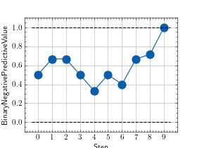 >>> from torch import rand, randint >>> # Example plotting multiple values >>> from torchmetrics.classification import BinaryNegativePredictiveValue >>> metric = BinaryNegativePredictiveValue() >>> values = [ ] >>> for _ in range(10): ... values.append(metric(rand(10), randint(2,(10,)))) >>> fig_, ax_ = metric.plot(values)