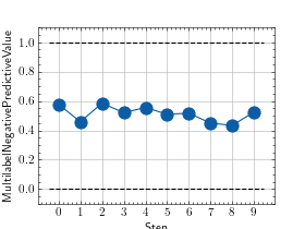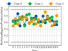 >>> from torch import rand, randint >>> # Example plotting multiple values >>> from torchmetrics.classification import MultilabelNegativePredictiveValue >>> metric = MultilabelNegativePredictiveValue(num_labels=3) >>> values = [ ] >>> for _ in range(10): ... values.append(metric(randint(2, (20, 3)), randint(2, (20, 3)))) >>> fig_, ax_ = metric.plot(values)