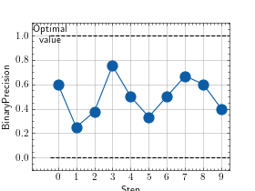 >>> from torch import rand, randint >>> # Example plotting multiple values >>> from torchmetrics.classification import BinaryPrecision >>> metric = BinaryPrecision() >>> values = [ ] >>> for _ in range(10): ... values.append(metric(rand(10), randint(2,(10,)))) >>> fig_, ax_ = metric.plot(values)