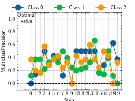 >>> from torch import randint >>> # Example plotting a multiple values per class >>> from torchmetrics.classification import MulticlassPrecision >>> metric = MulticlassPrecision(num_classes=3, average=None) >>> values = [] >>> for _ in range(20): ... values.append(metric(randint(3, (20,)), randint(3, (20,)))) >>> fig_, ax_ = metric.plot(values)