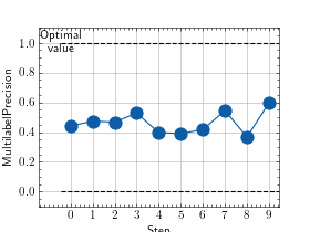 >>> from torch import rand, randint >>> # Example plotting multiple values >>> from torchmetrics.classification import MultilabelPrecision >>> metric = MultilabelPrecision(num_labels=3) >>> values = [ ] >>> for _ in range(10): ... values.append(metric(randint(2, (20, 3)), randint(2, (20, 3)))) >>> fig_, ax_ = metric.plot(values)