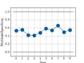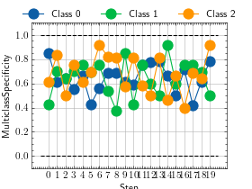 >>> from torch import rand, randint >>> # Example plotting multiple values >>> from torchmetrics.classification import MultilabelSpecificity >>> metric = MultilabelSpecificity(num_labels=3) >>> values = [ ] >>> for _ in range(10): ... values.append(metric(randint(2, (20, 3)), randint(2, (20, 3)))) >>> fig_, ax_ = metric.plot(values)
